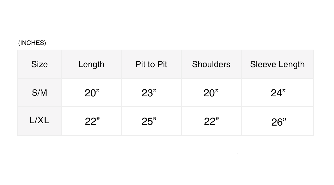 Length: 20″ | Pit to Pit: 23″ | Shoulders: 20″ | Sleeve Length: 24″
